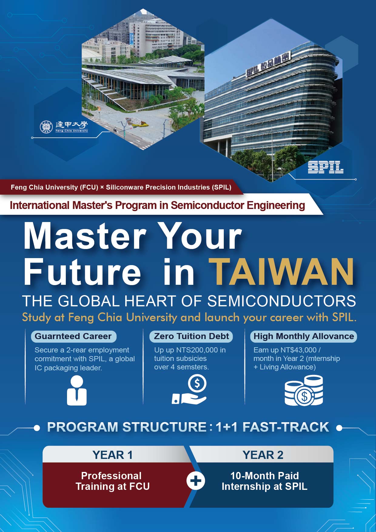 Students admitted to the program receive financial support from both the government and Siliconware Precision Industries Co., Ltd. (SPIL) during their period of study. Upon graduation, recipients are required to fulfill a post-graduation employment commitment in Taiwan, with the service period equivalent to the duration of the living stipend provided by SPIL. Specifically, students who receive two years of SPIL living allowances are obligated to complete two years (24 months) of employment at SPIL after graduation.